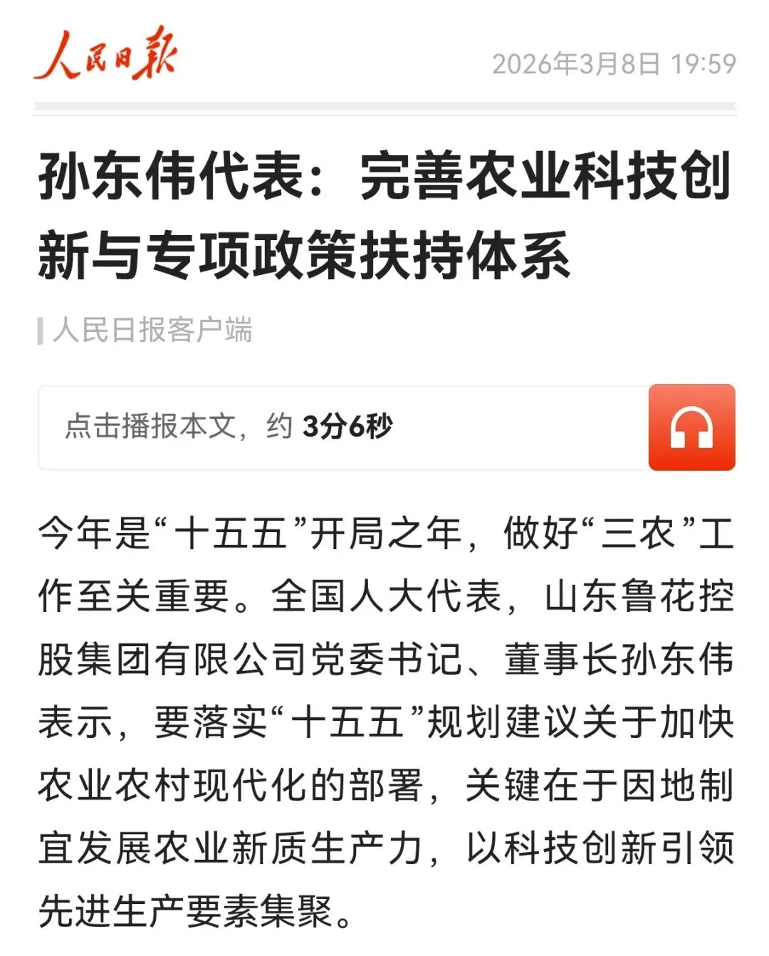 今年是“十五五”开局之年,做好“三农”工作至关重要。全国人大代表,山东鲁花控股集团有限公司党委书记、董事长孙东伟表示,要落实“十五五”规划建议关于加快农业农村现代化的部署,关键在于因地制宜发展农业新质生产力,以科技创新引领先进生产要素集聚。