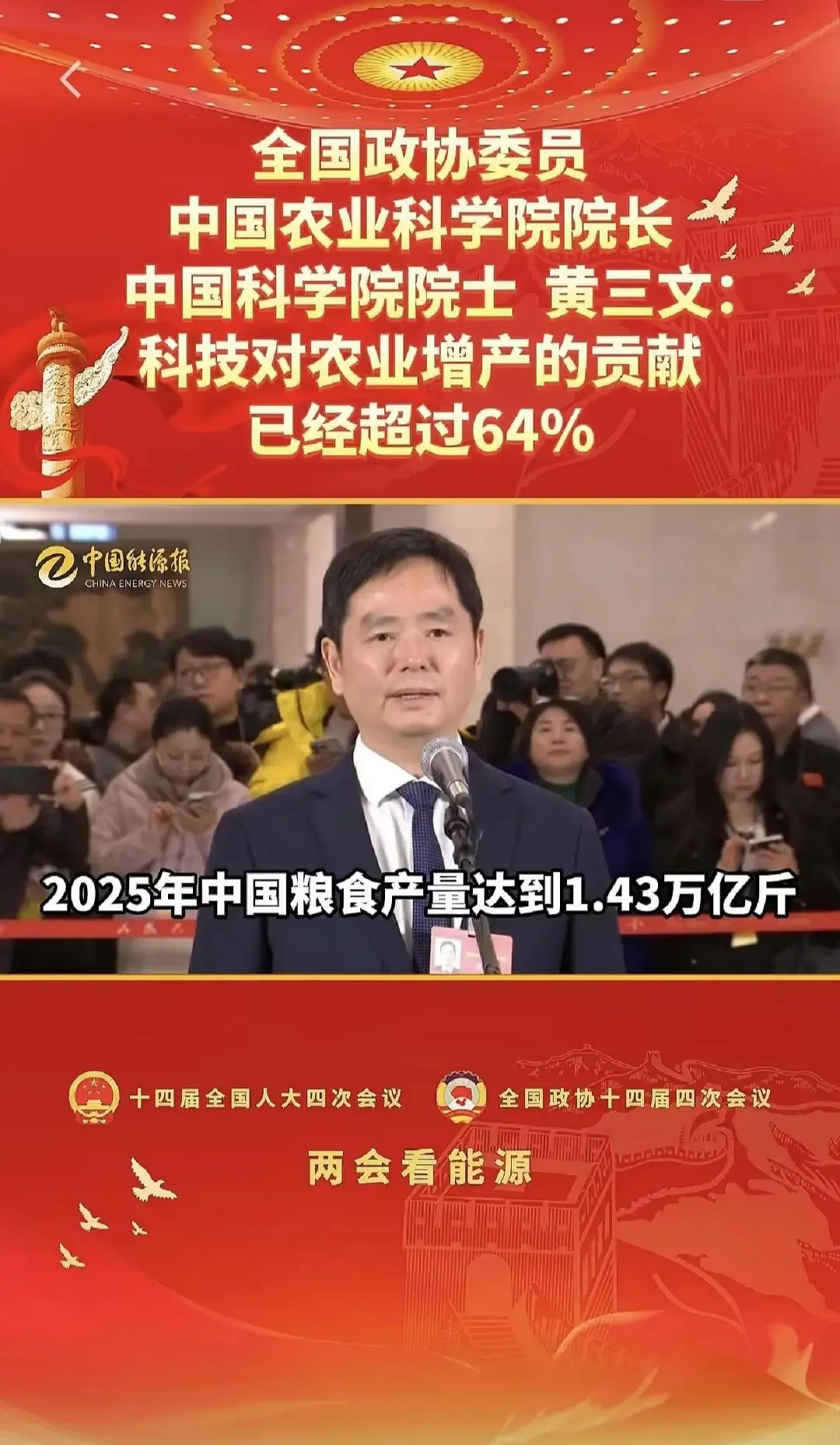 全国政协委员、中国农业科学院院长、中国科学院院士黄三文:科技对农业增产的贡献已经超过64%全国两会|全国人大代表、中国工程院院士、中国农业大学教授张福锁,今年两会将聚焦肥料涨价,农民种地成本提高问题,为老百姓发声。声明:除原创内容及特别说明之外,推送稿件文字及图片均来自网络及各大主流媒体。版权归原作者所有。如认为内容侵权,请联系我们删除。