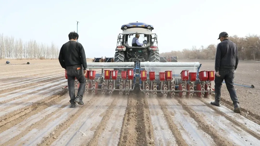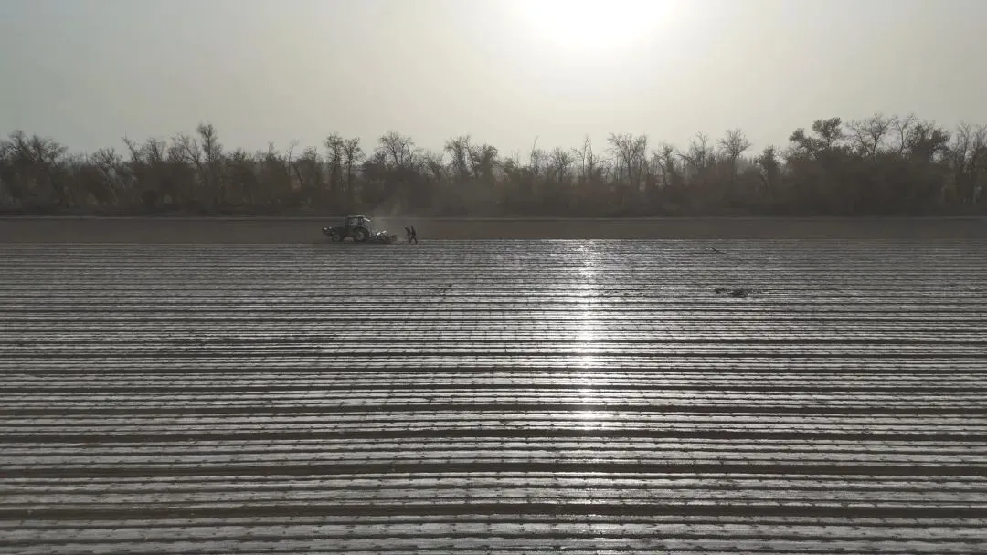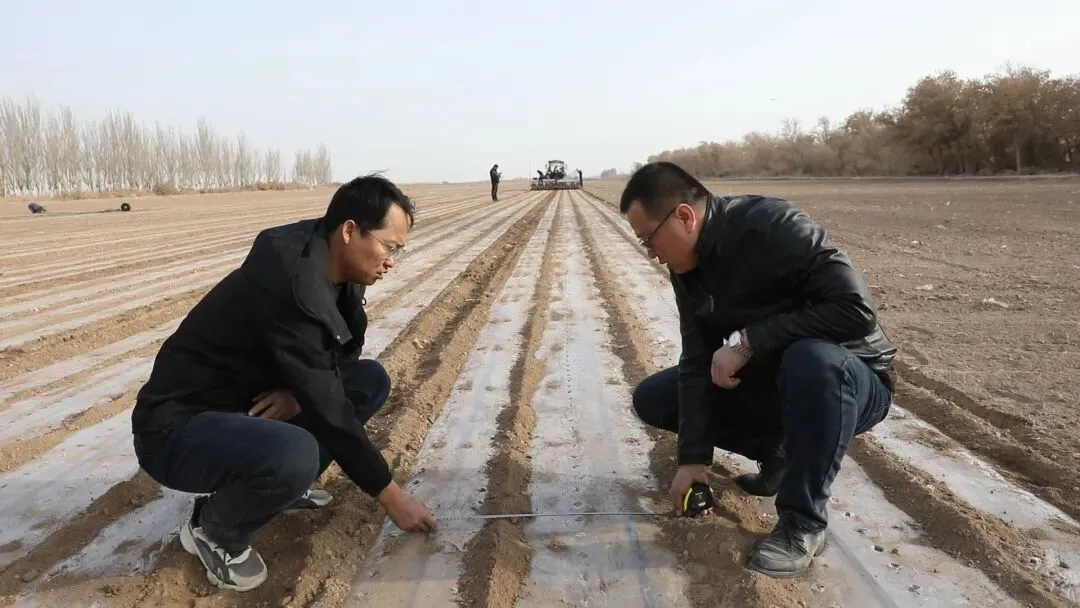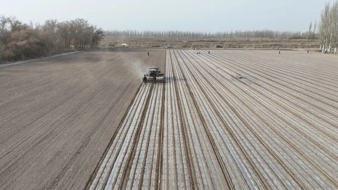 在连片平整的条田里,职工张海军正忙着指挥工人压实地膜,防范风沙影响孜然出苗。按照种植计划,孜然将于6月收获,随后复播玉米,实现“一地两收”。