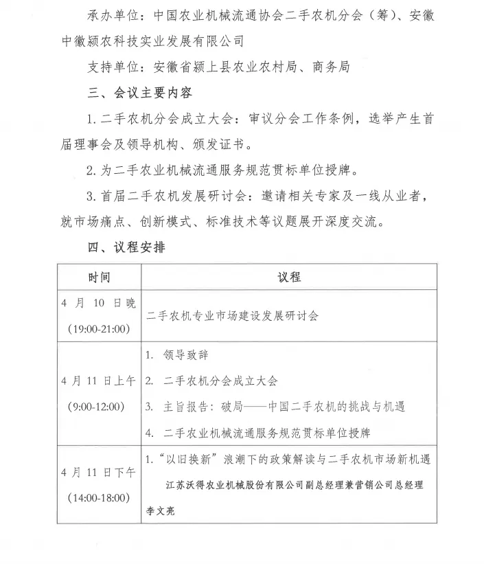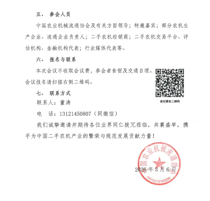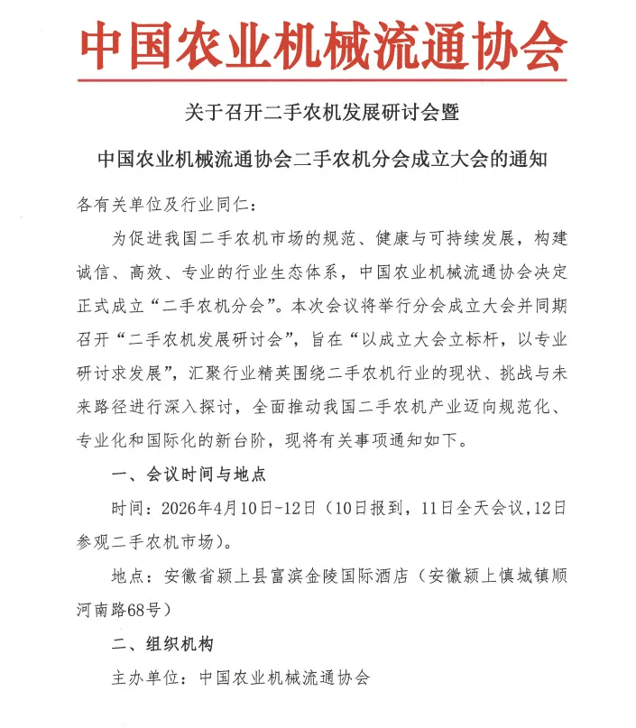为促进我国二手农机市场的规范、健康与可持续发展,构建诚信、高效、专业的行业生态体系,中国农业机械流通协会决定正式成立“二手农机分会”。本次会议将举行分会成立大会并同期召开“二手农机发展研讨会”,旨在“以成立大会立标杆,以专业研讨求发展”,汇聚行业精英围绕二手农机行业的现状、挑战与未来路径进行深入探讨,全面推动我国二手农机产业迈向规范化、专业化和国际化的新台阶,现将有关事项通知如下。