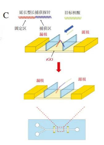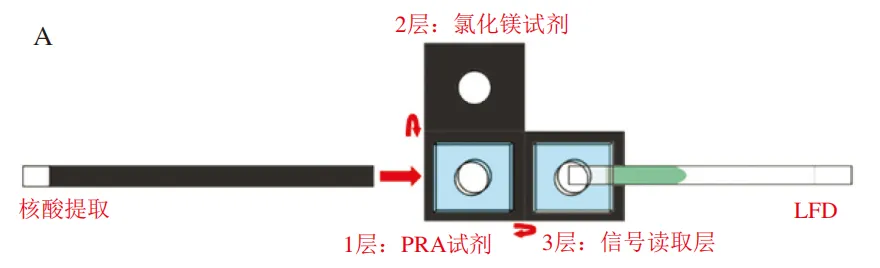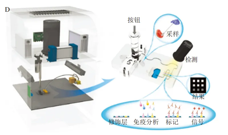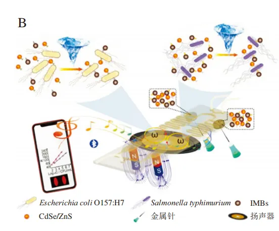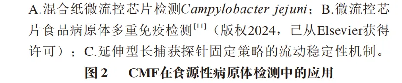 基于CMF平台的实时检测技术,凭借其快速、灵敏、便捷的特点,展现出克服现有检测局限的巨大潜力。CMF结合多种检测原理,可在不同应用场景下实现高效的病原体检测:1)基于比色法的CMF检测技术,利用CMF结合等温核酸扩增原理,通过喷蜡打印制备纸基层芯片,包括DNA提取区、重组酶聚合酶扩增(RPA)区和侧流检测试纸条(LFD)检测区,可以快速检测目标菌株。该芯片利用纸棒从样品中提取DNA,微流体在纸纤维上流动,并通过特异性引物进行RPA,LFD技术检测目标核酸片段,简化了传统的离心和移液操作,使检测时间从15 h缩短至30 min(图2A)。2)基于荧光的CMF检测技术,微流控芯片采用“前真空储液室”设计,预先封装免疫磁珠(IMBs)和荧光量子点微球(QDMs)于真空负压环境中。检测时,用户通过注入预处理样品,同时用金属针刺破芯片下层聚二甲基硅氧烷(PDMS)膜,利用负压驱动释放储液室内的试剂,使微流体通过蛇形通道进入孵育室。利用特异性修饰IMBs捕获抗体,与大肠杆菌O157:H7和鼠伤寒沙门氏菌结合,形成抗原-抗体复合物。同时,荧光量子点(CdSe/ZnS QDMs)修饰的检测抗体与抗原结合,形成双抗夹心复合物(IMBs-抗原-QDMs)。通过音频振动提高抗原-抗体结合效率,再由外部磁场捕获磁珠,使IMBs-抗原-QDMs被固定,未结合物质经清洗通道排出,实现病原菌的富集和分离,在紫外光照射下发出强红色荧光并利用荧光信号强度进行定量分析(图2B)。3)基于电信号的CMF检测技术,通过将特异性探针固定于还原氧化石墨烯(rGO)上,微流体溶液中的目标DNA片段与捕获探针结合形成稳定的双链DNA,导致rGO晶体表面电荷分布变化,进而改变电导性。通过场效应晶体管(FET)实时监测信号变化,实现灵敏的特异性检测(图2C)。