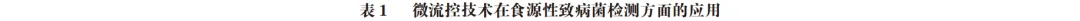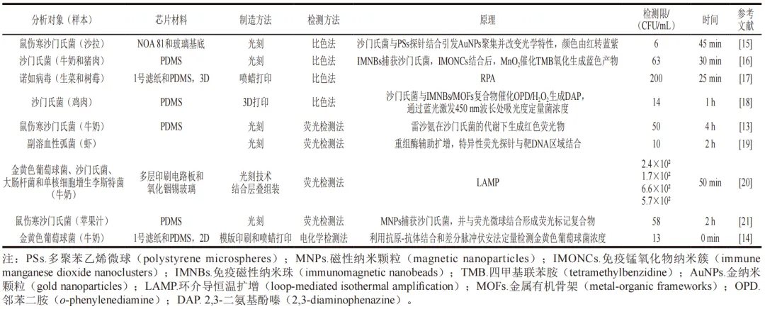 表1总结了多种微流控技术在食源性致病菌检测方面的应用,如用特异性标记的方法荧光检测牛奶中的沙门氏菌,检测限为50 CFU/mL,检测时间为4 h;用电化学方法记录峰电流变化量,定量检测金黄色葡萄球菌的浓度,检测限为13 CFU/mL,且无需长时间检测。与传统技术相比,微流控技术极大地缩短了检测时间以及降低了检测限,适合高通量快速检测。