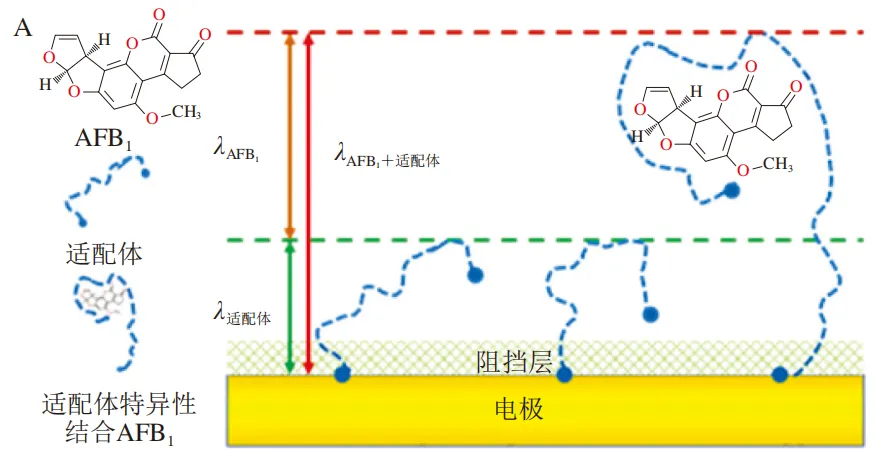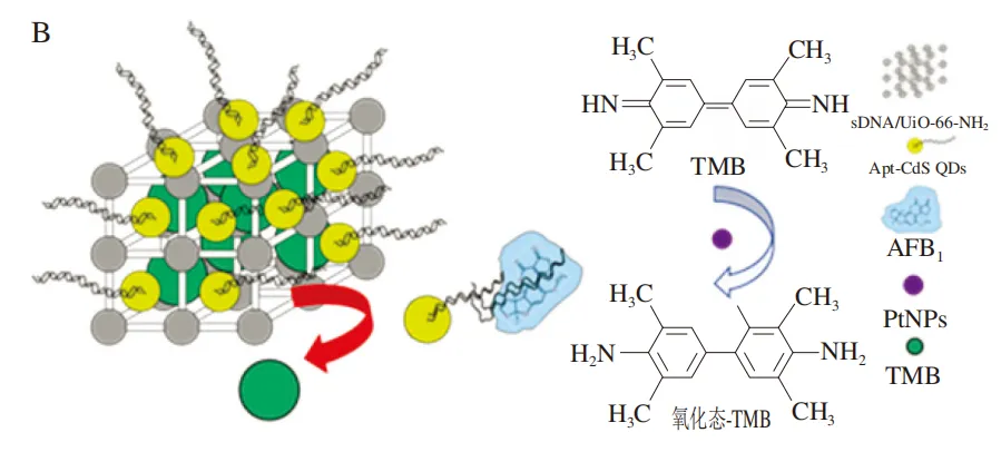 霉菌毒素由曲霉等真菌产生,污染谷物及食品,毒性强且难去除,可致癌、损伤肝肾、引发基因突变。常见种类如黄曲霉毒素(AF)、伏马菌素(FB),多存在于玉米、小麦等作物中。霉菌毒素存在痕量污染、难以检测的问题,微流控技术能够通过集成多种技术的方法实现其快速检测:1)基于比色法的CMF检测技术,利用AuNPs和36-mer适配体检测赭曲霉毒素A(OTA)。当OTA存在时,适配体与其结合,导致AuNPs聚集,表面等离子体共振(SPR)峰红移,溶液颜色由红色变为蓝紫色。通过吸光度比值可反映OTA浓度,无需提取或净化,可检测水、玉米和花生中的OTA,检测限分别为0.242、0.546、0.096 μg/mL,且在低浓度下只需反应5 min即可得到检测结果,展现出高灵敏性;2)基于电信号的CMF快速检测AFB1技术已被开发。一种微流控印制电路板适配体传感器可利用交流电热效应富集AFB1并测量电容变化,检测限为0.62 fmol/L,在1 fmol/L~10 pmol/L范围内线性良好,20 s内完成检测,可精准检测全麦面粉、玉米粉和糙米粉等样品中的AFB1残留,成本低于1 美元(图3A)。另一种便携式双模式纸质芯片采用侧向流动式微流控系统进行设计,基于侧向层析原理,通过毛细作用驱动流体在芯片内自动流动,无需依赖外部泵辅助,具备高度集成与便携化特性。其核心结构包含电化学发光(ECL)检测区、毛细驱动通道和显色分析区,流体从样品入口出发,依次流经ECL区和显色区完成检测。该芯片通过适配体门控的MOFs纳米开关控制信号释放,多孔UiO-66-NH2 MOFs封装显色剂TMB,表面修饰的CdS量子点-适配体复合物作为分子门控。当AFB1存在时,适配体特异性识别靶标并解离门控结构,释放TMB与适配体修饰的CdS量子点复合物至流体中。流体在毛细作用下沿纸质通道自动流动,首先通过ECL区触发CdS量子点与电极反应生成电化学信号,随后携带TMB进入显色区产生颜色变化。这种双模式检测机制通过流体自主驱动与定向迁移,同步输出电信号和比色信号,其检测限分别为7.8 fg/mL(ECL)和9.5 pg/mL(比色),在0.05 pg/mL~50 ng/mL范围内线性良好,成功应用于玉米检测,回收率分别为90%~101%,与高效液相色谱结果一致。两种方法均具备高灵敏度、低成本和快速检测的优势(图3B)。