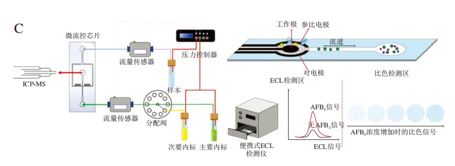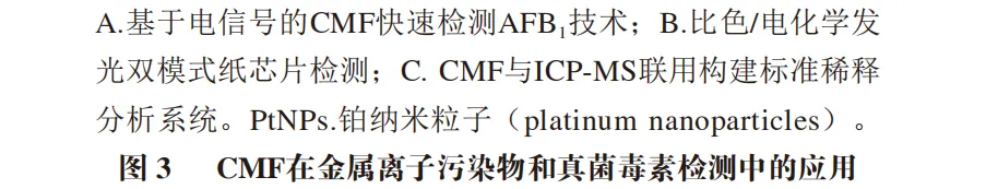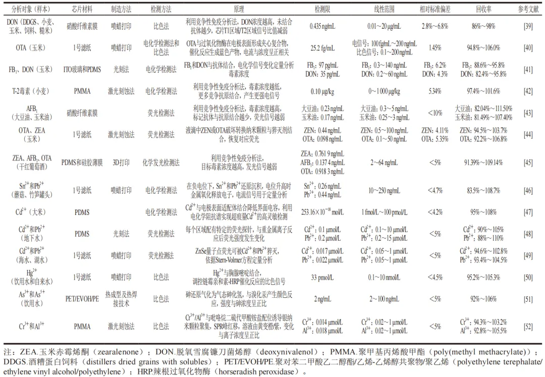 重金属离子是食品中的主要污染物之一,来源包括天然环境和人为活动,具有难降解、高毒性和生物富集性的特点,长期积累即使在低浓度下也可严重威胁健康,如铅损害神经发育、镍引发器官损伤、铜过量致中毒。基于CMF的金属离子检测方法主要包括质谱法、电化学、荧光等。Mavrakis等通过时间分辨信号检测技术,将CMF与ICP-MS联用,构建了标准稀释分析系统。该系统可优化气动压力泵和低流速参数,实现样品与校准溶液的自动混合,并利用ICP-MS采集时间分辨信号计算离子浓度。该系统检测限分别低至0.14 ng/L(Cd)、0.24 ng/L(Co)、1 μg/L(Cr和Ni),线性范围为5~10 μg/L,回收率达97.4%~100.1%,展现了高灵敏、快速检测的优势(图3C)。Wang Liyan等通过CMF的荧光检测技术,结合离子印迹聚合物的选择性识别能力,成功开发旋转式布/纸混合微流控装置,通过荧光猝灭效应检测Hg2+和Pb2+,检测限分别为0.18 μg/L和0.07 μg/L,线性检测范围为0.5~20 μg/L,回收率在96.2%~114.1%,成功应用于河水和海水样品检测。这些方法与传统检测结果一致,具有低样品消耗、高灵敏度和自动化操作的优势,而微流控技术结合不同技术,可实现真菌毒素和金属离子的快速检测(表2)。