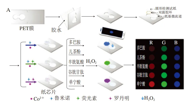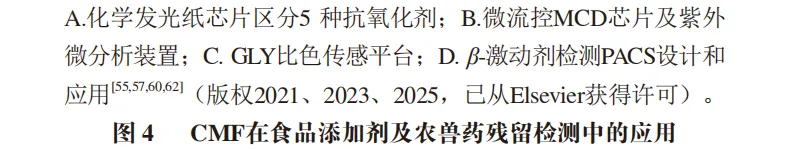 食品添加剂如姜黄素、焦糖色素和番茄红素等,广泛用于改善食品感官、延长保质期和防止氧化腐败。然而,滥用或非法添加食品添加剂可能引发食品安全问题。为了有效检测食品中的添加剂和抗氧化剂,近年来基于CMF开发了多种快速检测方法:1)基于发光强度检测,构建的CMF多色发光微流控纸芯片,可检测食品抗氧化剂。通过修饰鲁米诺-Co2+、鲁米诺-荧光素-Co2+和鲁米诺-罗丹明B-Co2+,在H2O2作用下分别产生蓝、绿、紫色光,强度与抗氧化剂种类呈现特异性响应。结合三原色光模式(RGB)、主成分分析(PCA)和层次聚类分析(HCA)成功区分多种抗氧化剂。该方法检测限为0.5 mmol/L,线性范围为0.5~10 mmol/L(图4A)。2)基于比色法CMF检测技术开发的光遮蔽反应微流控PMMA/纸基检测系统可用于食品中甜蜜素浓度检测,通过重氮化反应生成紫红色偶氮化合物,使用CMOS相机捕捉显色图像并定量,线性范围为50~1 000 μg/mL,检测限为20 μg/mL,应用于话梅、芒果干和蔓越莓检测,结果与液相色谱-串联质谱偏差小于4.8%。3)基于荧光CMF检测技术构建的微流控色谱检测系统可快速检测糖精钠和安赛蜜钾。目标物在芯片色谱通道分离后,在254 nm紫外光波长激发下产生荧光,通过CMOS成像和标准曲线定量,检测范围为50~2 000 μg/mL,检测限为50 μg/mL与高效液相色谱结果偏差小于6.3%,成功检测16 种商业食品(图4B)。这3 种方法都无需复杂仪器和复杂样品前处理,且具有快速、便携、高灵敏度优势。