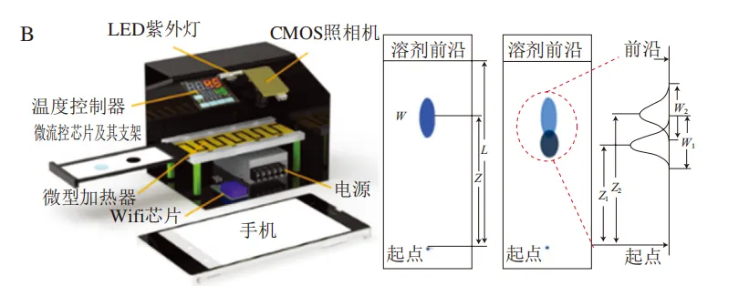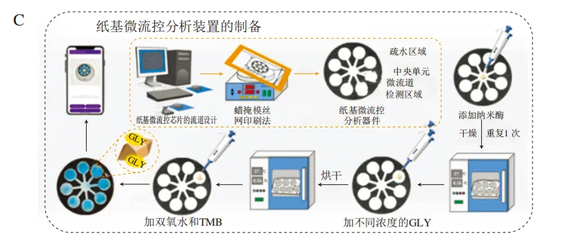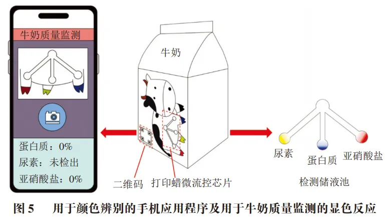在营养成分分析方面,CMF同样表现突出。例如,Fan Yiqiang等将纸基微流控设备嵌入牛奶包装,通过蜡打印通道和通道显色反应,定性检测尿素和亚硝酸盐并分析蛋白质含量,结果可通过手机应用程序获取,快速、低成本且操作简单,具有实际应用价值(图5)。