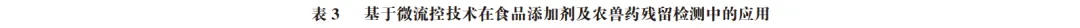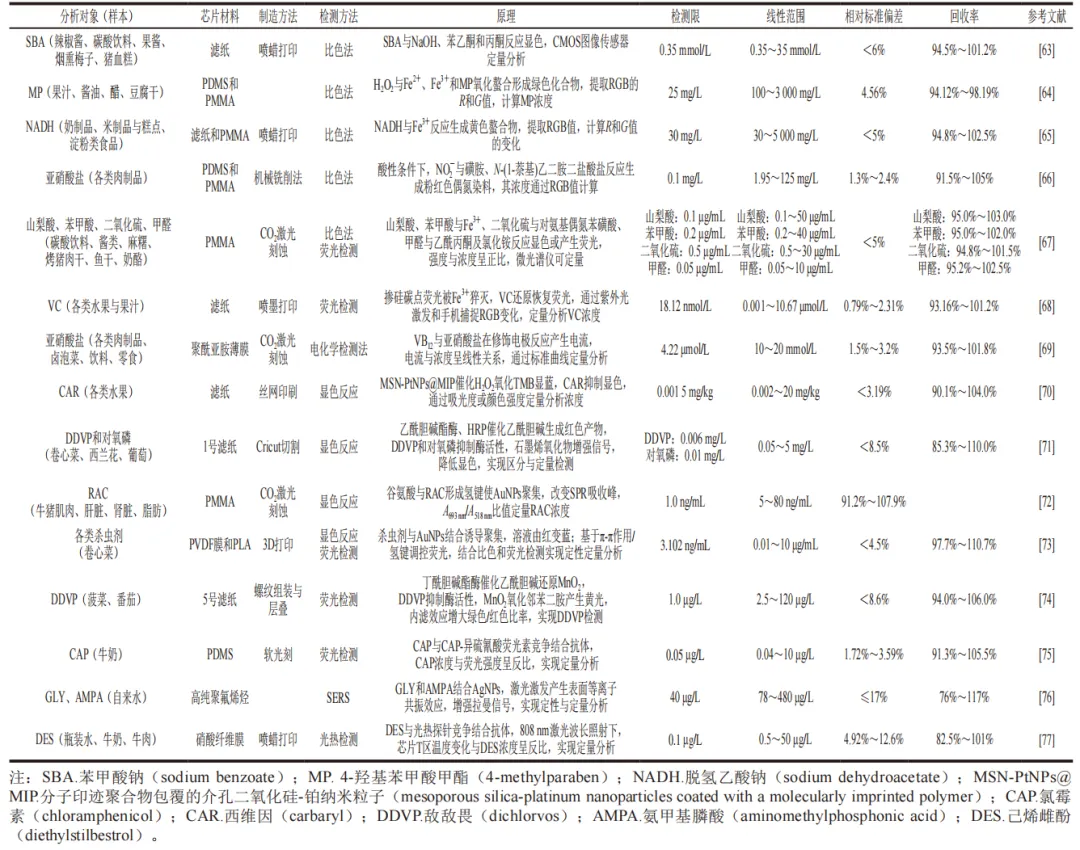 农药和兽药的广泛使用导致其在食品和环境中的残留问题直接威胁消费者健康,农药残留主要源于作物害虫防治,可能引发急慢性疾病;兽药(特别是抗生素)滥用导致动物食品中药物残留,引发过敏反应和抗药性微生物的产生,危害公共健康。因此,开发高效的残留检测方法是保障食品安全的关键。近年来,CMF为快速检测农药和兽药残留提供了新解决方案:1)基于比色检测构建的三金属MOF纳米酶纸基CMF平台,可用智能手机实现草甘膦(GLY)的现场快速检测。该平台通过三元金属有机框架(ZnCo-ZIFs@MIL-101(Fe))纳米酶催化H2O2与TMB反应生成蓝色氧化态TMB,GLY抑制酶活性降低显色强度,其在652 nm波长处的吸光度与浓度呈线性关系(图4C)。该方法检测限为1 ng/mL,线性范围为0.02~40 μg/mL,成功应用于卷心菜、橙子和黄芪样品。2)基于荧光检测构建的微流控生物传感芯片,可通过智能手机平台同步定量多种氟喹诺酮类抗生素。该平台利用上转换纳米材料-氧化石墨烯适配体(UCNPs-GO-Apt)荧光探针实现便携式现场检测,检测限分别为1.84 ng/mL(恩诺沙星)和2.22 ng/mL(环丙沙星),线性范围为1.0×101~1.0×105 ng/mL。3)基于化学发光检测构建的便携式微流控芯片系统(PACS)有3 层结构,顶层和底层由PDMS材料构成储液池与基板,中间层为硅膜反应层,其表面固定β-激动剂-牛血清白蛋白(Ag-BSA)结合物,通过增强抗原吸附能力显著提升检测灵敏度。系统通过集成微波阀与蠕动泵,结合线性驱动器精准调控微米级通道内流体的顺序流动,在负压驱动与微波阀垂直运动的协同作用下实现多步骤反应的全流程自动化,包括样品混合、免疫反应、洗涤及信号检测。系统采用间接竞争免疫分析法,样品中的β-激动剂与硅膜表面固定的Ag-BSA结合物竞争结合抗体,未结合的抗体经洗脱后,通过HRP标记的二抗催化化学发光底物生成信号,其强度与目标物浓度呈反比,而芯片设计的3 条平行反应带可同步检测克伦特罗(CLB)、莱克多巴胺(RAC)、沙丁胺醇(SAL),检测限分别为54、59 pg/mL和93 pg/mL,检测范围为62.5~2 000 pg/mL(图4D)。微流控技术为食品添加剂和农兽药残留快速检测提供了全新的解决方案(表3)。随着技术发展,微流控平台将推动食品安全检测进入新阶段,为应对复杂食品安全挑战提供有力支持。