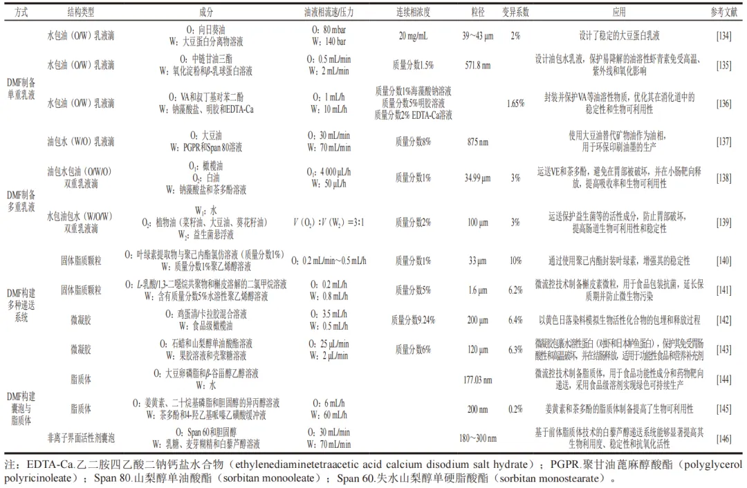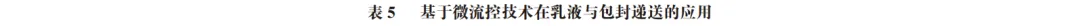 乳液在食品工业中可用于提高活性成分的稳定性、延长保质期,并改善溶液的口感和营养。传统制备乳液的方法在粒径控制和能效上有限,而微流控技术通过精确流体控制,能够显著提升乳液的制备效率、粒径调节和稳定性,同时保护生物活性成分。该技术广泛应用于食品、药物递送和生物医学领域,为保护、靶向递送和受控释放生物活性成分提供了创新解决方案(表5)。