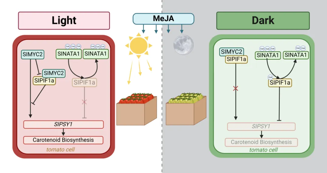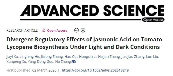 近日,中国农业大学园艺学院郭仰东和张娜团队在Advanced Science发表研究论文Divergent Regulatory Effects of Jasmonic Acid on Tomato Lycopene Biosynthesisunder Light and Dark Conditions,揭示茉莉酸(JA)在不同光照条件下双向调控番茄红素合成的分子机制,并阐明了SlPIF1a作为光-JA信号交汇枢纽的核心作用。