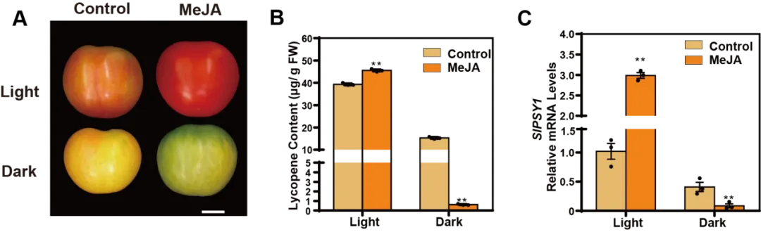 番茄红素是成熟番茄果实中最主要的类胡萝卜素,占总含量的90%以上。它不仅赋予番茄鲜红的外观,更是强效抗氧化剂,对人体健康具有重要价值。然而,番茄红素的积累受多种环境信号和激素的精细调控。此前关于JA对番茄红素合成影响的研究存在争议,阻碍了JA在生产中的实际应用。该研究明确了JA对采后番茄果实番茄红素的调控方向受光照条件影响:在光照下,JA显著促进番茄红素合成;但在黑暗条件下,JA反而强烈抑制番茄红素积累。番茄红素合成主要限速酶SlPSY1的基因表达量也表现出相同趋势。