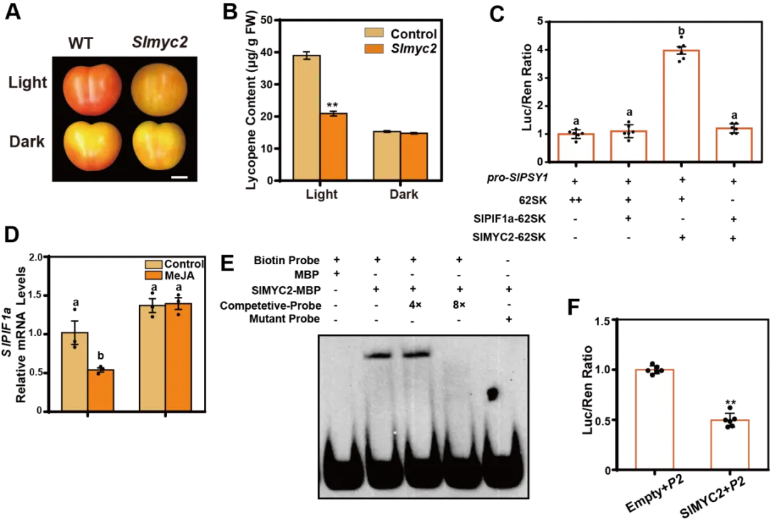那么光照如何改变JA的作用方向?研究锁定了两个关键蛋白:SlMYC2和SlPIF1a。SlMYC2作为茉莉酸信号通路的核心转录因子,负责激活下游番茄红素合成基因SlPSY1的基因表达。SlPIF1a是光信号通路的负调控因子,负向调控SlPSY1基因的表达。当番茄处于光照下,茉莉酸通过SlMYC2直接激活番茄红素合成关键基因SlPSY1的表达。敲除Slmyc2之后,光照下番茄红素合成速度显著减慢。同时,SlMYC2还会直接抑制SlPIF1a的转录,减少其蛋白质积累。