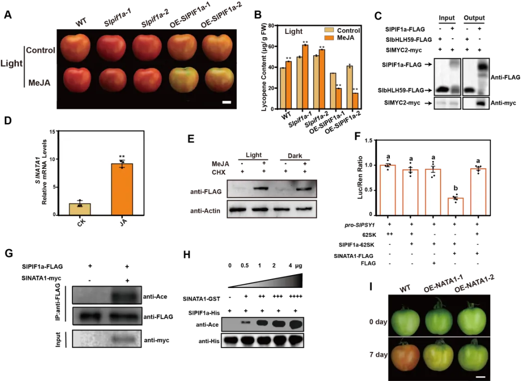 而当SlPIF1a蛋白过量存在时,即使在光照条件下,JA也能抑制番茄红素的合成。这是由于SlPIF1a一方面与SlMYC2互作,阻止后者激活SlPSY1;另一方面,JA诱导的乙酰转移酶SlNATA1与SlPIF1a互作,并对其进行乙酰化修饰,激活SlPIF1a对SlPSY1的转录抑制活性。双重刹车下,番茄红素合成途径被强力阻断。因此黑暗条件下,SlPIF1a蛋白的大量积累,是JA对番茄红素由促进转向抑制的关键分子开关。