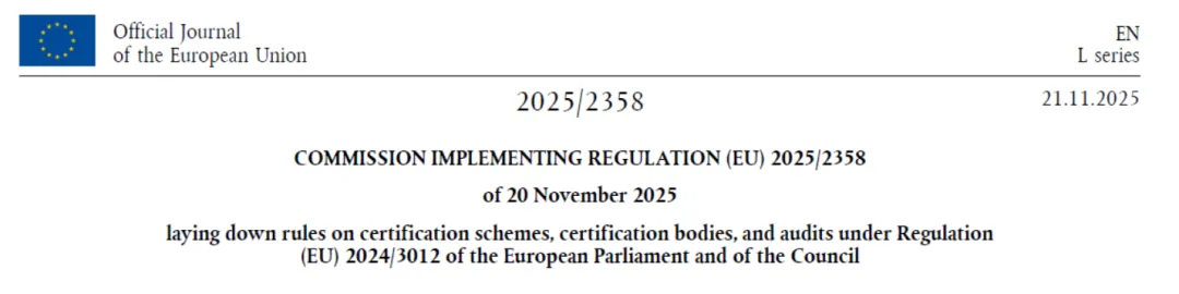 2025年11月21日欧盟委员会已经通过实施条例,为认证方案运作、认证机构和审核拟定了相应的认证规则。2026年4月将公开征集认证方案并进行评估,2026年第四季度将会对通过评估的认证方案颁发认可。