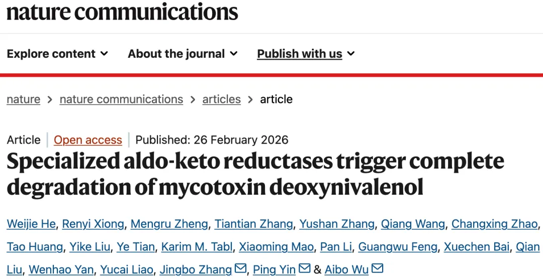 近日,华中农业大学和中国科学院上海营养与健康研究所等单位联合在真菌毒素生物降解领域取得突破,以“Specialized aldo-keto reductases trigger complete degradation of mycotoxin deoxynivalenol”为题在Nature Communications期刊在线发表,揭示了将DON毒素完全降解形成CO2和H2O的作用机制,系统阐明了降解过程的起始代谢路径及关键毒素降解酶,为保障粮食安全和农产品质量安全提供了原创性绿色防控新策略。