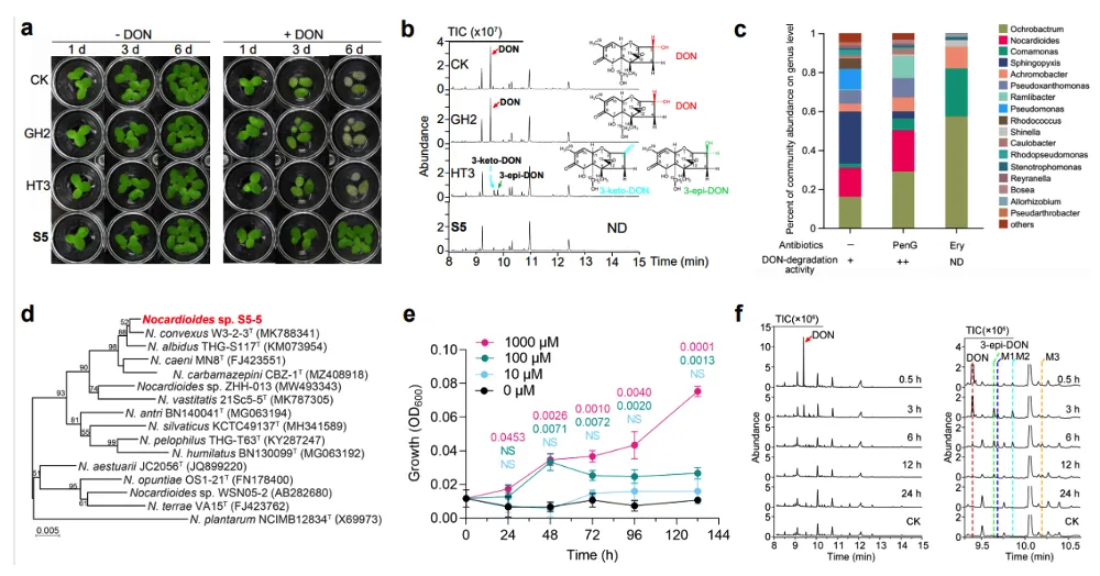研究团队首先利用基于毒性评估的降解菌筛选策略,从赤霉病高发的小麦田土壤中筛选获得高效降解DON毒素的菌群S5。通过抗生素选择性富集与16S rDNA测序,锁定类诺卡氏菌属(Nocardioides sp.)为功能核心,最终分离得到纯菌株 S5-5。生长曲线检测、高分辨质谱分析和13C同位素示踪表明,该菌株能以DON毒素为唯一碳源或能量来源进行生长,并彻底破坏DON分子骨架结构,将其完全降解形成CO2和H2O。此外,菌株S5-5还可降解新茄病镰刀菌烯醇(NEO)、雪腐镰刀菌烯醇(NIV)以及3-乙酰脱氧雪腐镰刀菌烯醇(3Ac-DON)等多种镰刀菌毒素,展现出优异的广谱降解潜力。