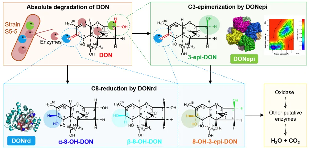 研究团队对DON毒素降解中间代谢物的动态积累规律进行研究发现,S5-5对DON的完全降解由两条不同代谢路径同时开启,分别是C3-异构化和C8-还原途径。其中,DON经C3-异构化途径生成中间代谢物3-异构-DON(3-epi-DON),经C8-还原途径则生成中间代谢物α/β-8-羟基-DON(α/β-8-OH-DON)。并且,经C3异构化途径生成的3-epi-DON又可进入C8-还原途径,进一步降解生成8-羟基-3-epi-DON。然后通过基因组测序、细菌人工染色体文库(BAC)构建、功能筛选及基因异源表达验证,发现两个新醛酮还原酶DONepi 和DONrd分别催化DON的 C3-异构化和C8-还原过程。