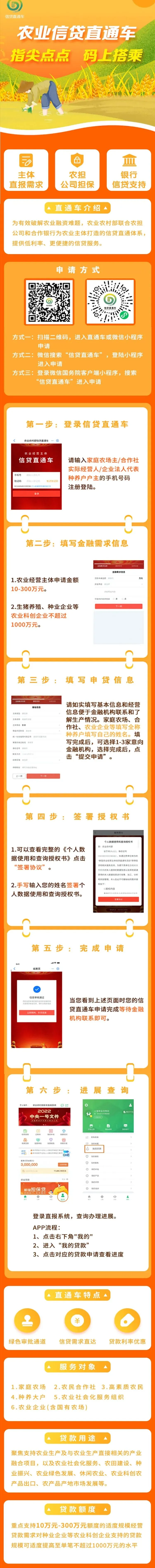 农业信贷直通车聚焦破解新型农业经营主体融资难、融资贵问题,打造“主体直报需求、农担公司提供担保、银行信贷支持”的直通车体系,有效助力新型农业经营主体信贷申请,为家庭农场,农民合作社提供更为便捷有效的金融服务。