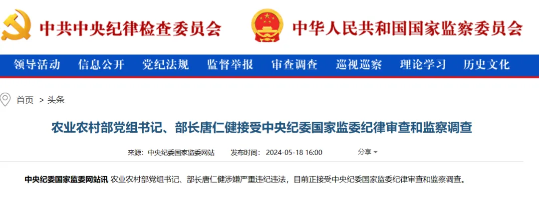 据中央纪委国家监委网站消息,农业农村部党组书记、部长唐仁健涉嫌严重违纪违法,目前正接受中央纪委国家监委纪律审查和监察调查。