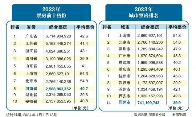 猫眼专业版数据显示,2023年全年各省份电影票房中,河南省以25.9亿元的票房位列第8名,郑州市以7.4亿元的成绩位列全国各城市票房第14名。本月我省将有4次冷空气过程,当前我省大部冬小麦进入越冬期,各地应密切关注天气变化,冬小麦做好麦田分类管理,加强设施农业生产管理。