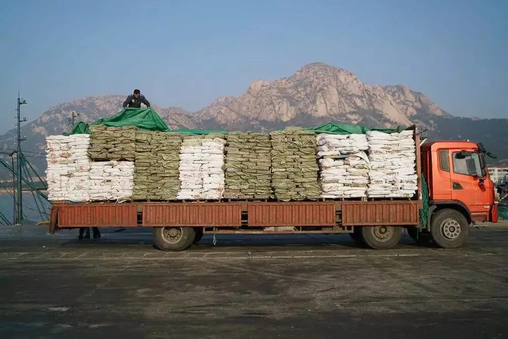 2016年12月17日,山东石岛的一家鱼粉厂里,工人正在将生产好的鱼粉装袋和装车。这些鱼粉将被运往全国各地的饲料加工厂,加工成各种配合饲料后,再转卖给养殖户喂养各种鱼类和家畜。