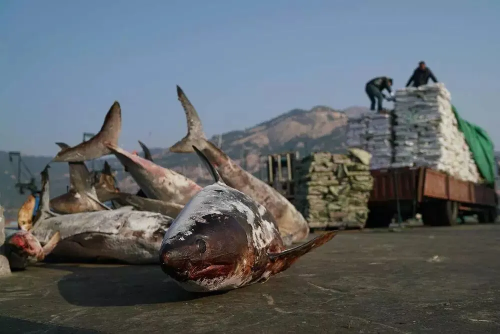 2016年12月17日,山东石岛码头,除了正在装车的饲料鱼,还有正被当做货物卸下的鲨鱼尸体,这些鲨鱼主要被用于加工鱼翅。渔获中的鲨鱼大多来自渔船的兼捕,据估计每年捕捞量在1万到1万5千吨左右,对鲨鱼种群来说,这些都属于非必要性死亡。