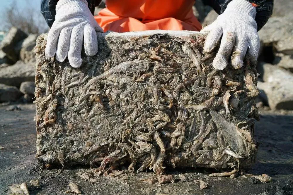 2016年12月15日,山东石岛的一家鱼粉厂内。这块鱼板里面是大量有食用价值鱼类的幼鱼,包括带鱼、黄鲫、鲐鱼。