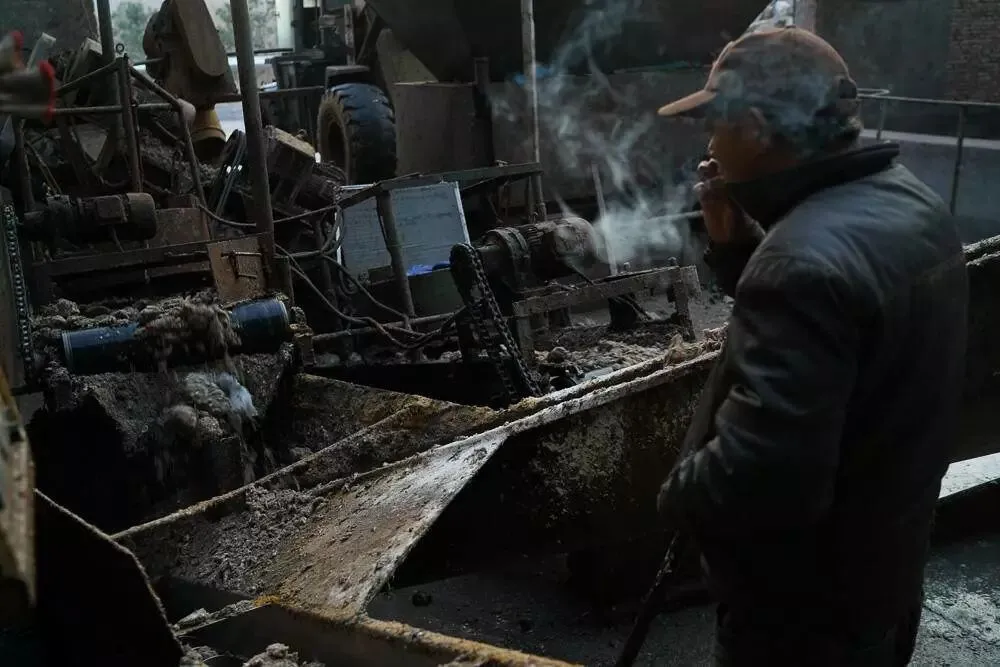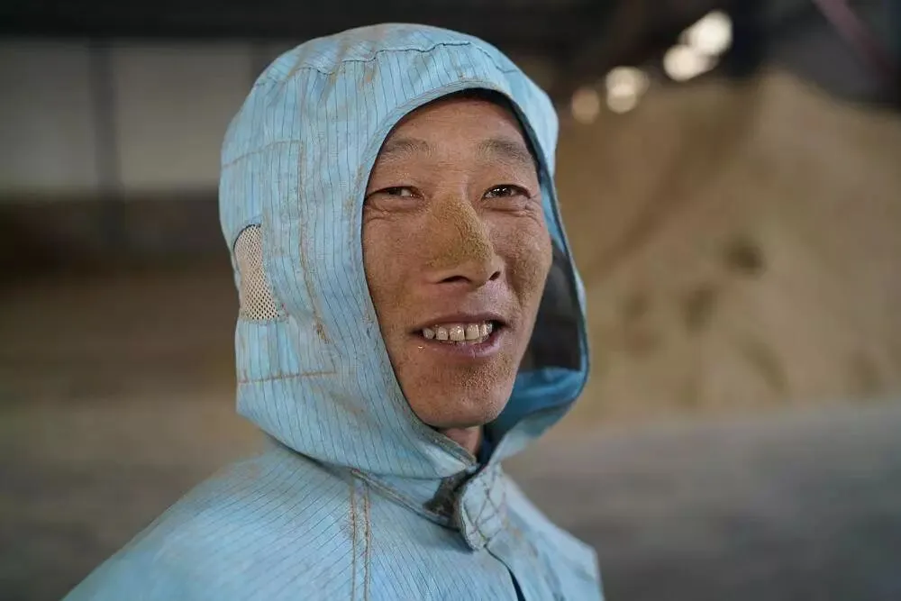 2016年12月17日,山东石岛的一家鱼粉厂里,一个浑身沾满了鱼粉的工人。即使是正规的鱼粉厂,厂区里也会有一种混合着鱼腥味的特殊味道,而那些不太正规的小型鱼粉厂,车间里则往往充满了普通人难以忍受的腐臭味道。