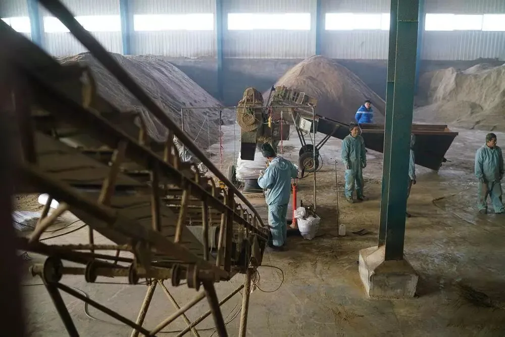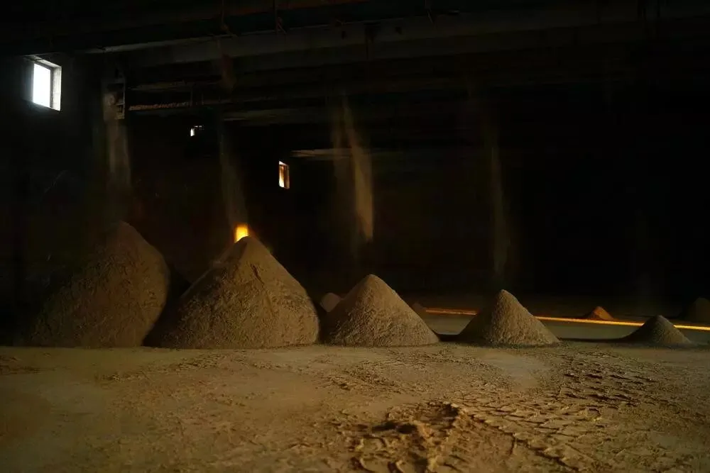 2016年12月15日,山东石岛一家鱼粉厂的成品仓库里,鱼粉正在从房顶的传输带上一点点撒下,堆积到一定高度后,再由工人包装出厂,销往全国各地。