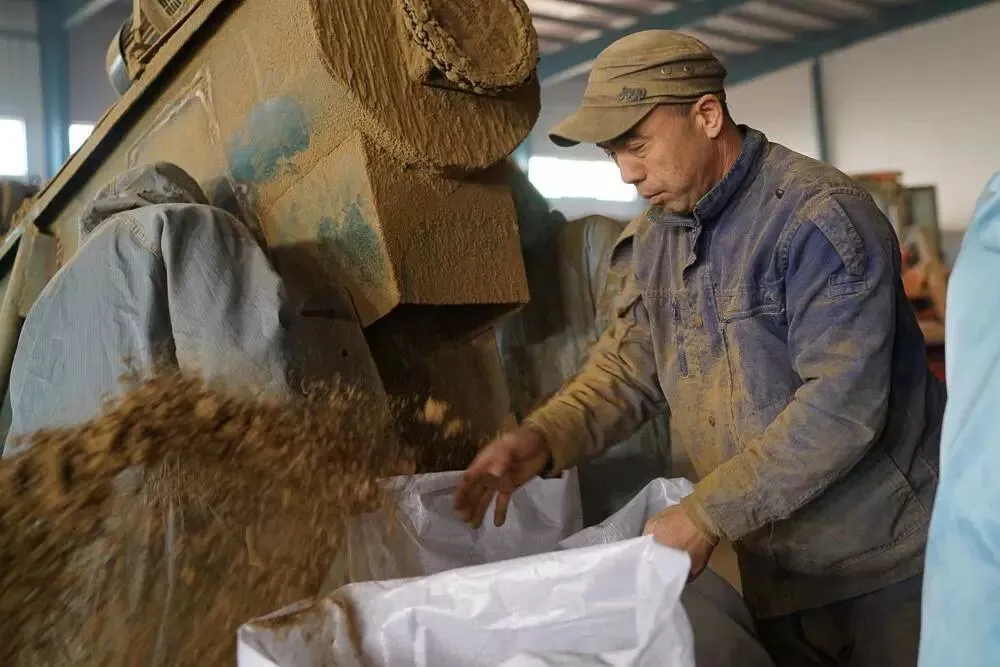2016年12月17日,山东石岛一家鱼粉厂里的工人。鱼粉厂老板说,我们这里是全国最大的鱼粉生产基地。