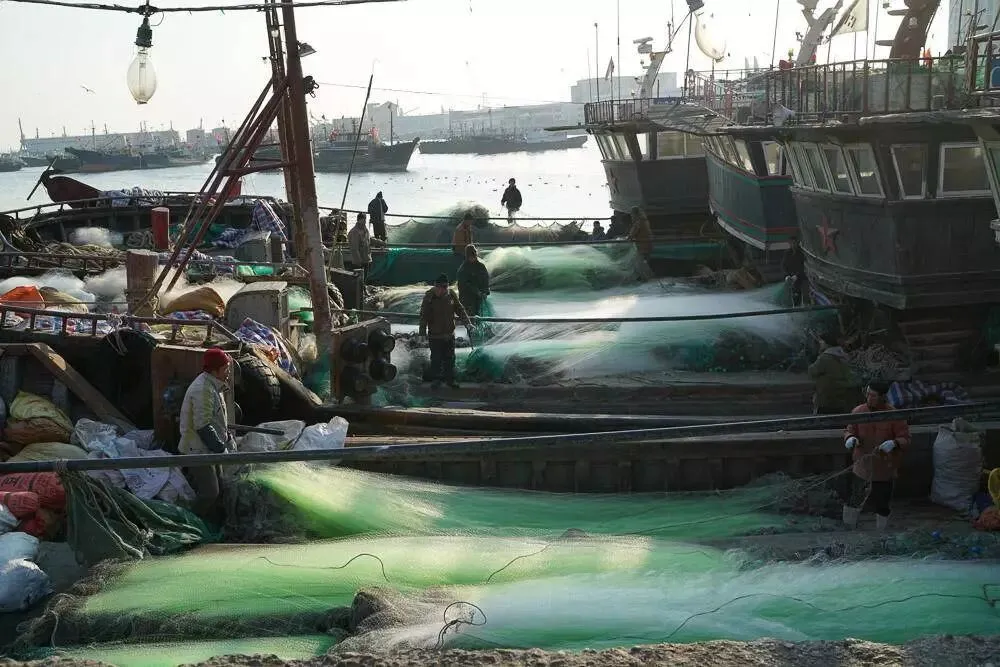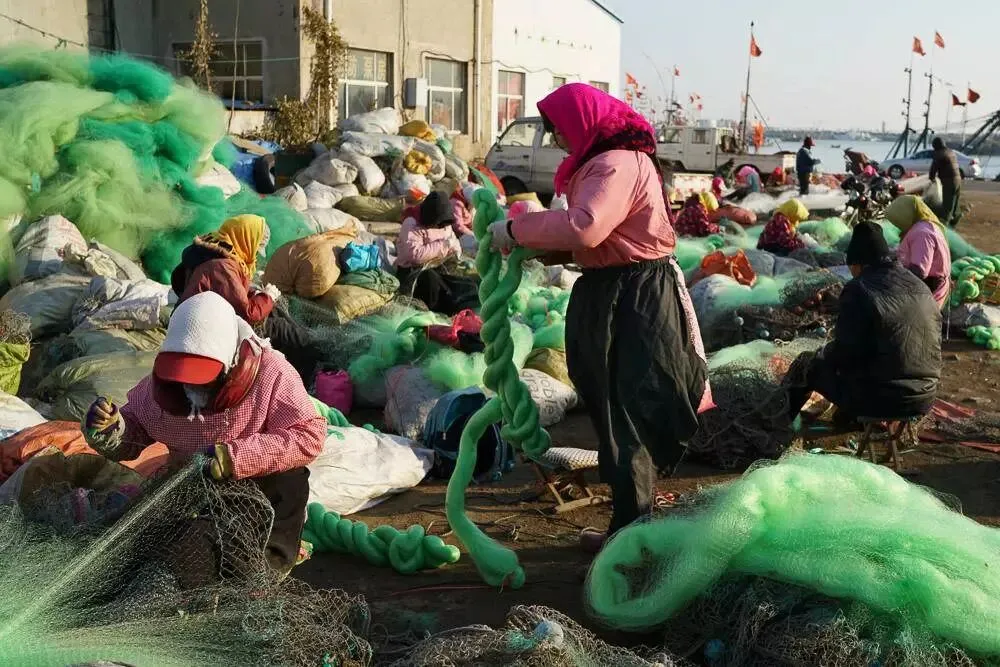 2016年12月16日,山东石岛,女人们在码头边织补渔网。为了更好地管理渔业资源,中国出台了一系列渔业管理规定,包括规定禁渔期、禁渔区、渔网网眼的尺寸、准用和禁用渔具的类型等等,但对饲料鱼的捕捞和交易仍缺乏系统性的管控。