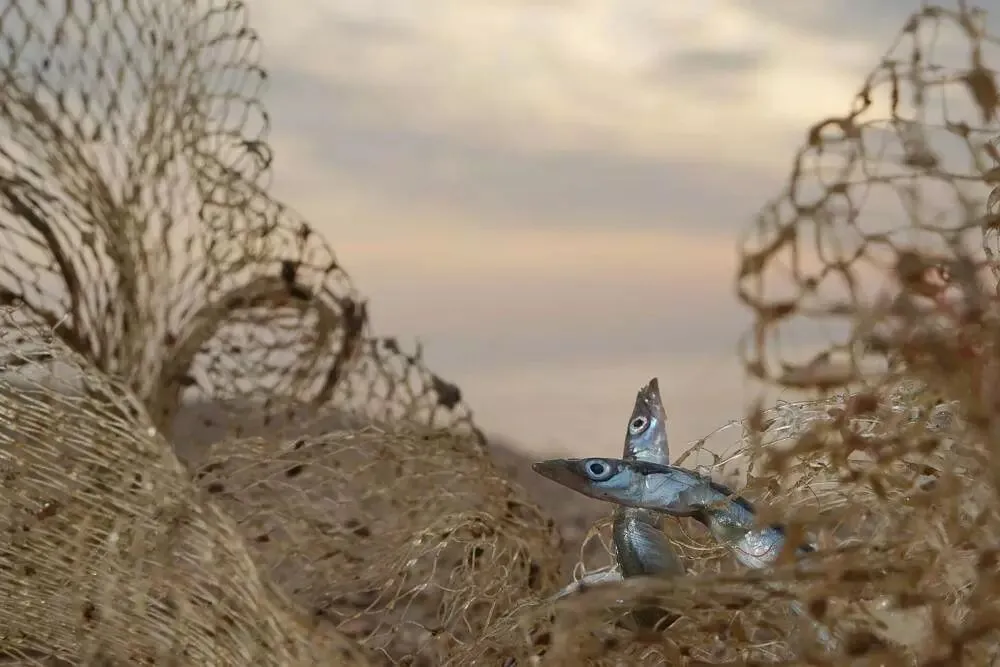 2016年12月,山东石岛,渔网里的两条小鱼。近海无鱼的出路到底在哪?靠海吃饭的渔民说,“船少一点、网眼大一点,让小鱼长大再捕,就不愁没有好鱼”;渔业资源研究者说,“使用替代饲料,或是生态养殖,任何鱼虾的养殖都可以实现使用‘零’鱼粉饲料”;关心海洋的艺术家说,“我们如果不是仅仅把海洋看做我们的食物来源,其实,海洋可以给我们更多”。