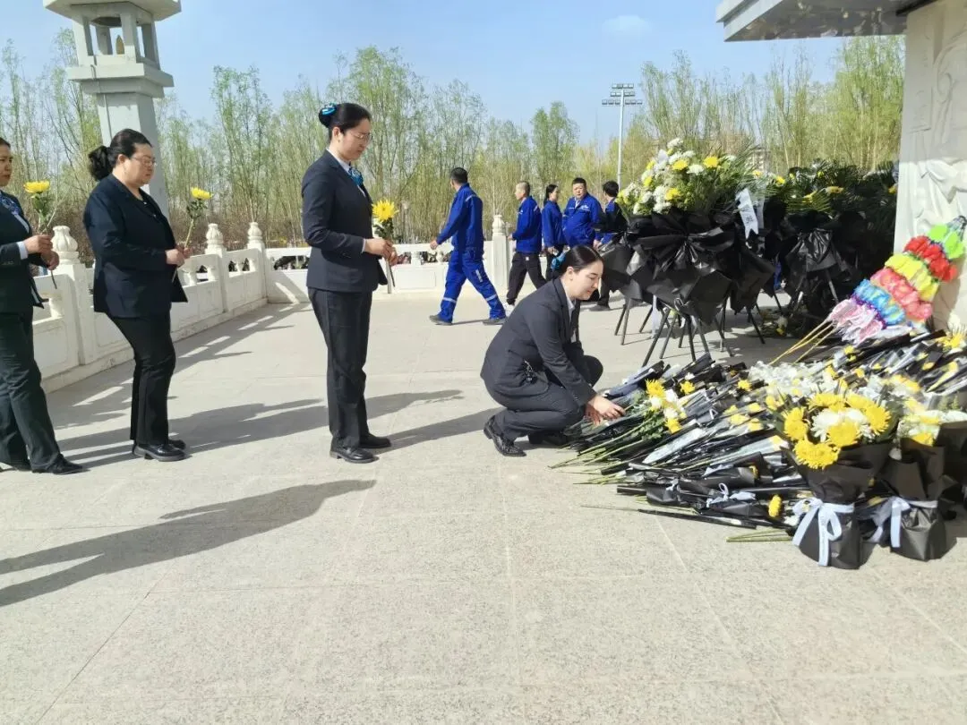 农行新疆阿克苏市支行组织员工在庄严肃穆的阿克苏人民英雄纪念碑前集体默哀,敬献鲜花,表达对革命先辈的深切怀念和无限敬仰。
