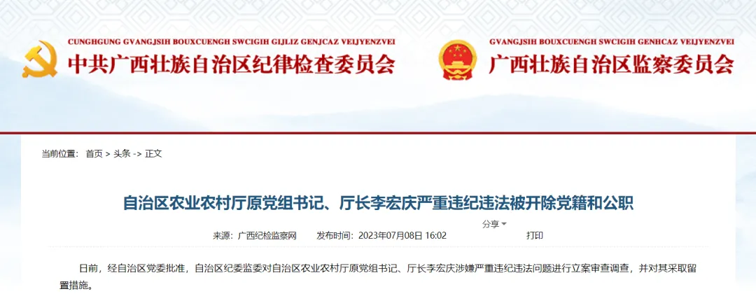 据广西纪检监察网7月8日发布的消息,日前,经自治区党委批准,自治区纪委监委对自治区农业农村厅原党组书记、厅长李宏庆涉嫌严重违纪违法问题进行立案审查调查,并对其采取留置措施。