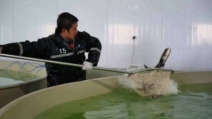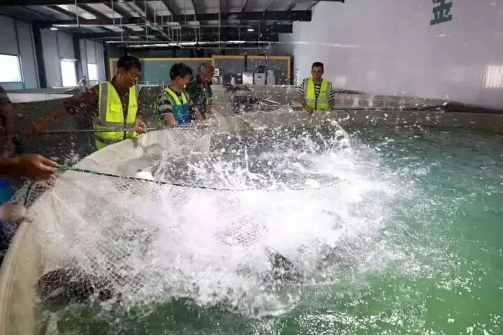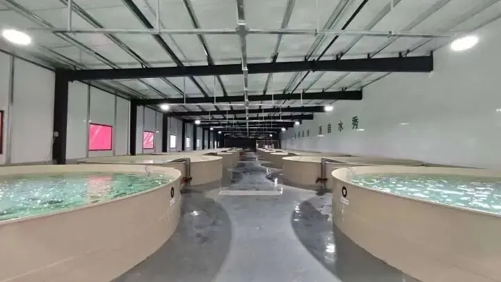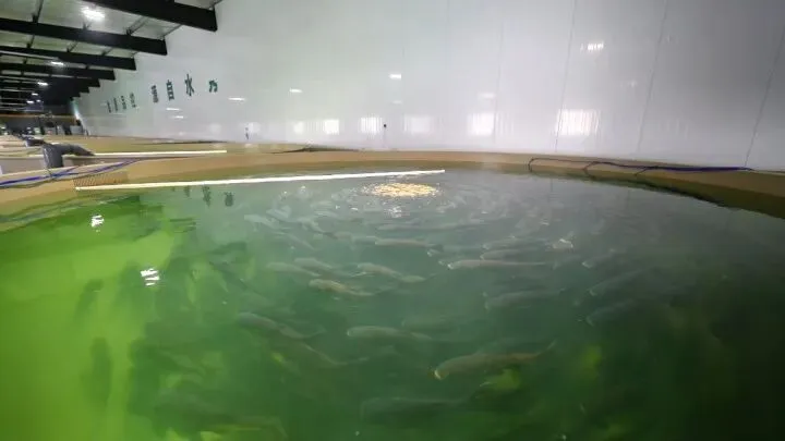 走进千岛湖金源渔业,眼前的景象令人震撼——一个个直径6米4的巨型水池整齐地分布在车间,每个水池里都有成群的鱼儿自在游动,不时泛起细密涟漪。