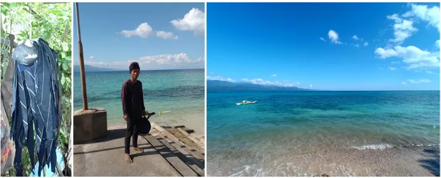 Fig. 3 Divers équipements et méthodes de déplacement des pêcheurs de céphalopodes. A) Un bitsoy imitant l'apparence d'une pieuvre (Octopus cyanea). B) Un pêcheur en apnée accédant à un système récifal corallien proche avec une pana (ou harpon). C) Un pêcheur se rendant en bateau sur un récif corallien distant pour pêcher au filet.