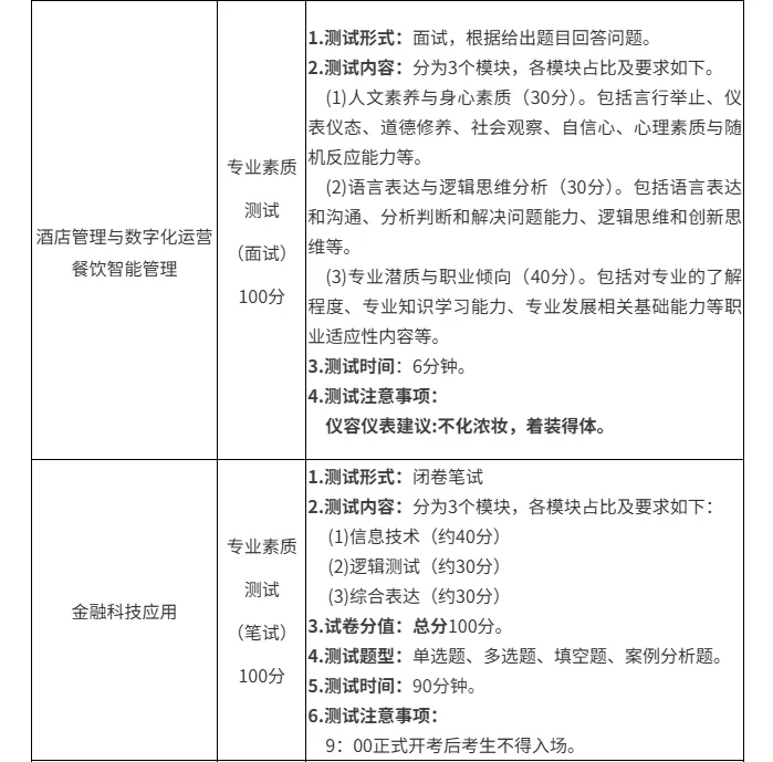 1.测试形式有面试、笔试,不同专业的测试时间分为上午和下午两个时段,上午9:00和下午12:30后禁止考生入场。