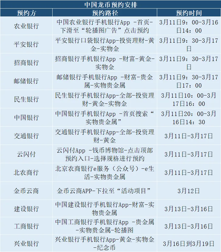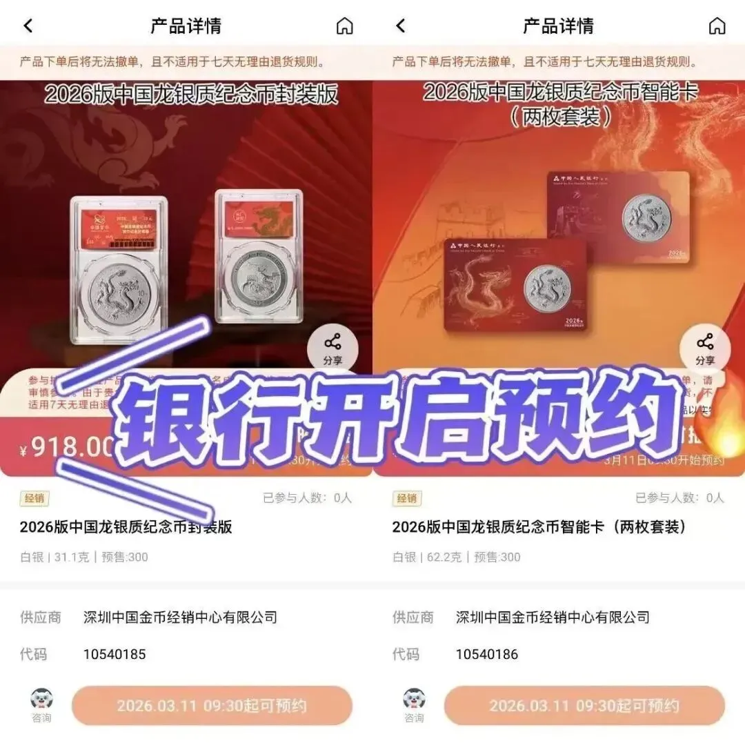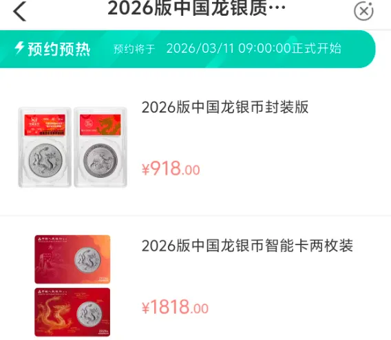 注意,2026新10元纪念币,农业银行昨天(3月11日)9:00起率先开启线上预约!更加关键的是,这枚新币大涨2000多,藏友们可别错过了!其面值10元,为31.104克普制银币,发行200万枚。在3月初,其发行纪念封装版开启了线上抽签预约,一共有337万人参与!发行价918元的它,市价一路飙升,最新成交价达到3150元。由于首次放出的数量仅2.4万枚,中签率仅0.7%。与此同时,1套2枚的中国龙币智能卡,同样大涨!其发行价为1818元,目前市价达到2400元附近!目前其入口已经更新,在手机银行首页轮播图中,即可找到。除农行外,中国银行、邮储银行、招商银行、民生银行和平安银行,也将在今日开启预约。一共有6大入口可以预约,(又有新入口,根据金总信息,昨天共9大入口可约,表格已更新)每人都可以跨行参与,最多能预约18枚。各大行都是抽签预约,不分时间前后,我们只需在截止时间前参与即可。此外,更多预约即将开启,小编也会时刻关注,及时整理最新的入口和安排。提醒藏友们:因为公众号更改了推送规则,记得读完点点"赞"和"在看",这样每次藏品之友的新文章推送才会第一时间出现在你的订阅列表里。大家有任意钱币上的问题,都可以在公众号直接发消息询问,小编看到后就会回答。欢迎大家点击关注藏品之友,每天都会发布靠谱的钱币知识。有空右下角点赞一下,就是对小编最大的支持!