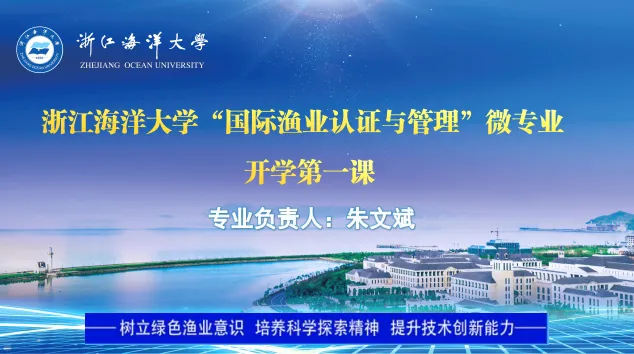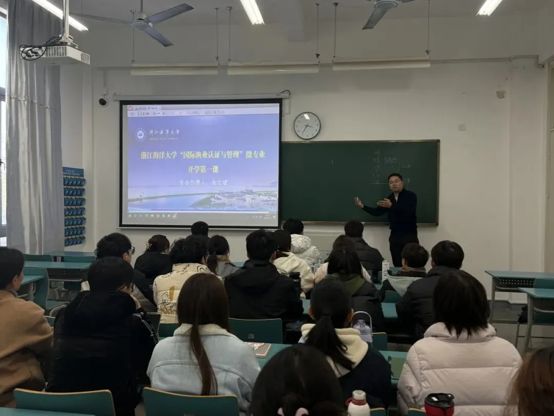 3月10日下午,水产学院“国际渔业认证与管理”微专业开学第一课在浙江海洋大学教学楼215教室举行。微专业负责人、正高级工程师朱文斌主讲,首届微专业全体25名学生参加。