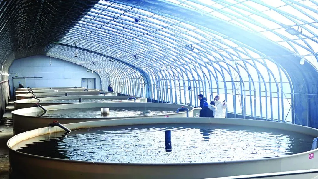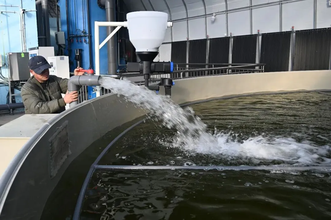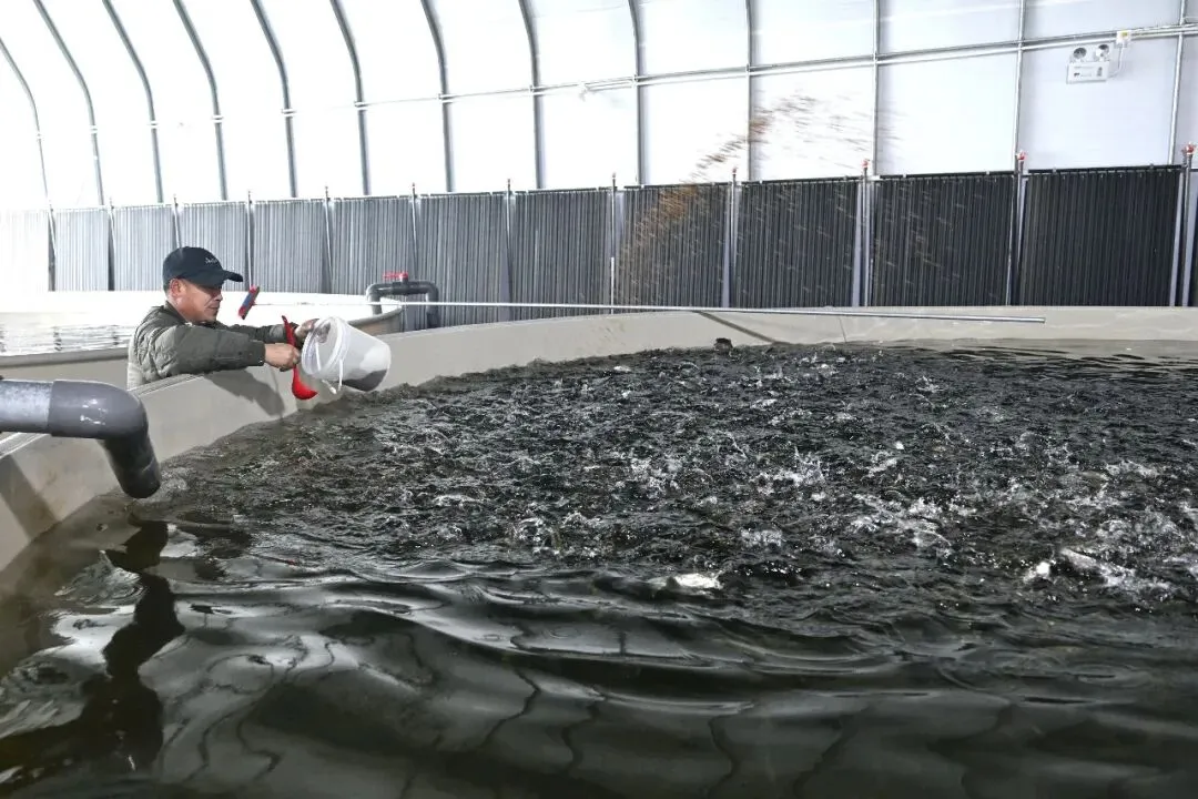 在黑龙江爱江渔业冷水鱼养殖繁育基地项目的繁育车间内,虹鳟鱼苗在水中欢快地游动。