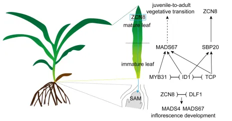 开花是植物从营养生长转向生殖生长的关键转折点,对作物产量至关重要。玉米作为重要的粮食作物,其开花时间受到光周期和自主途径(与内部发育信号相关)的双重调控。在光周期不敏感的温带玉米中,INDETERMINATE1 (ID1)是自主开花途径的核心调控因子,但其表达局限于幼嫩叶片的基部,关于其如何调控SAM中花器官基因的表达进而影响生殖转换和开花时间的具体作用机制长期未明。
