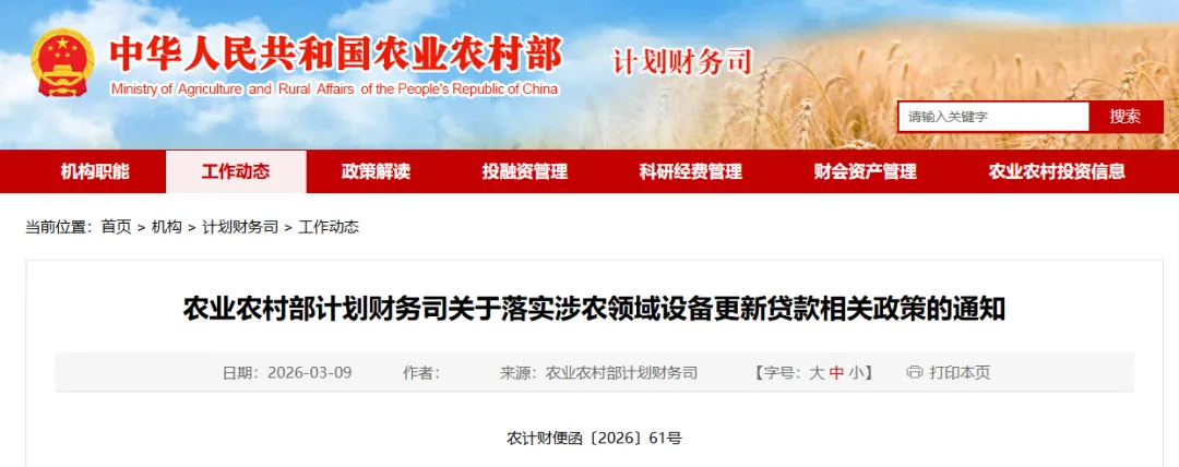 各省、自治区、直辖市及计划单列市农业农村(农牧)、畜牧兽医、农垦、渔业厅(局、委),新疆生产建设兵团农业农村局,部有关司局单位: 贯彻落实党中央、国务院决策部署,根据《中国人民银行 国家发展改革委 科技部 工业和信息化部 交通运输部 农业农村部关于设立科技创新和技术改造再贷款有关事宜的通知》(银发〔2024〕72号)和《财政部 国家发展改革委 中国人民银行 金融监管总局关于优化实施设备更新贷款财政贴息政策的通知》(财金〔2026〕2号)等要求,为进一步引导加大对涉农领域设备更新和技术改造的金融支持力度,助力扩大农业农村有效投资,现就落实涉农领域设备更新贷款相关政策通知如下。