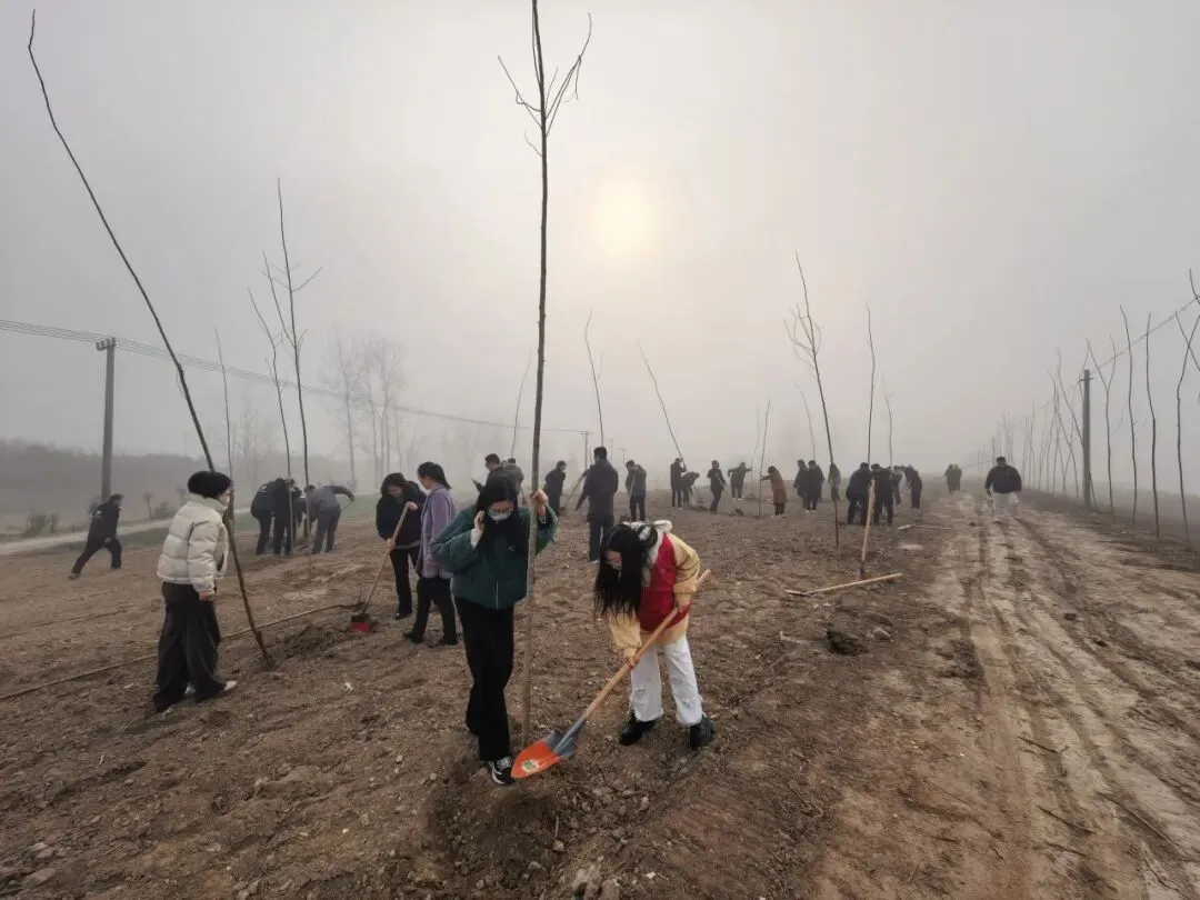 活动现场,参与者们被分为多个小组,分工明确、默契协作:有的挥锹挖坑、铲土培实,动作娴熟有力;有的扶苗定位、校准垂直度,确保苗木扎根稳固;有的提水浇灌、压实土层,细心呵护每一株新苗。大家热情高涨、干劲十足。现场铁锹碰撞声、浇水声、欢声笑语交织在一起,勾勒出一幅热火朝天的春日植绿画卷。
