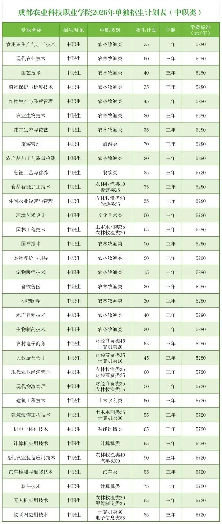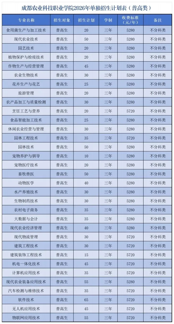 2026年成都农业科技职业学院单独招生计划2800名。其中:普高类1120名,中职类1680名。招生专业、计划、收费标准均以四川省教育考试院公布为准。