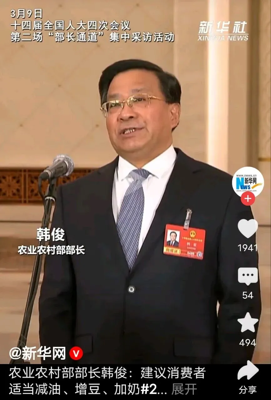 就在前不久的十四届全国人大四次会议“部长通道”上,农业农村部部长韩俊掷地有声地发出呼吁:“建议消费者适当减油、增豆、加奶!”