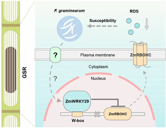 ZmWRKY29负调控玉米GSR抗性的机制模式图