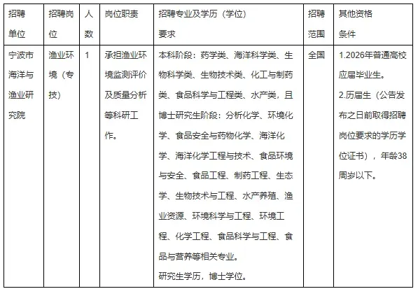 根据《宁波市事业单位公开招聘工作人员实施办法》,经中共宁波市农业农村局党组同意,宁波市农业农村局下属事业单位宁波市海洋与渔业研究院决定面向社会公开招聘事业编制工作人员1名。现就有关事项公告如下: