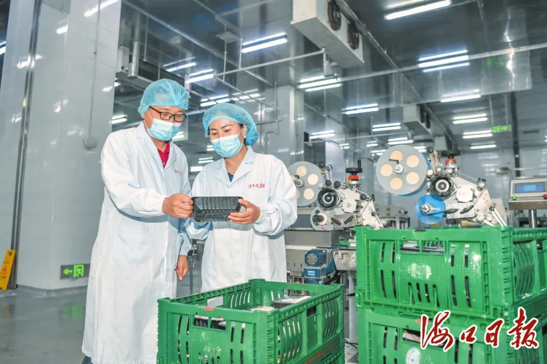 在海南(潭牛)文昌鸡股份有限公司生产车间,张旭丽(右)查看产品出品情况。海口市融媒体中心记者 孙士杰 摄(资料图)