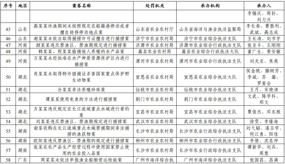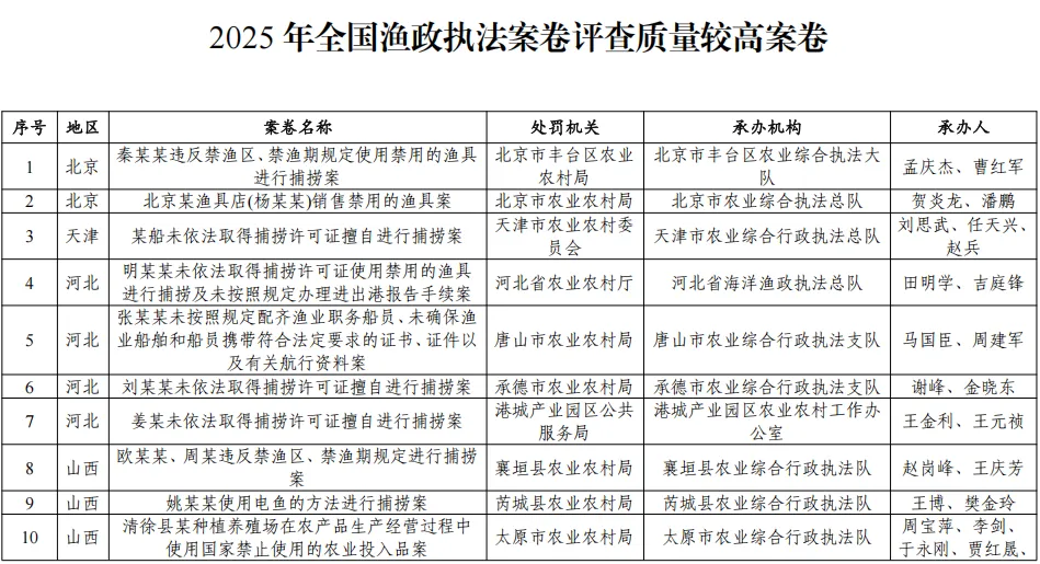 为进一步规范渔政执法工作,提升渔政执法人员办案能力和案卷制作水平,有效推动渔政执法队伍业务素质整体提升,按照中共中央办公厅、国务院办公厅《关于加强行政执法协调监督工作体系建设的意见》和国务院办公厅《提升行政执法质量三年行动计划(2023—2025年)》(国办发〔2023〕27号)推进行政执法案卷评查有关要求,农业农村部组织开展了2025年全国渔政执法案卷评查工作,并于近日印发《农业农村部办公厅关于2025年渔政执法案卷评议情况的通报》,公布2025年渔政执法质量较高案卷。