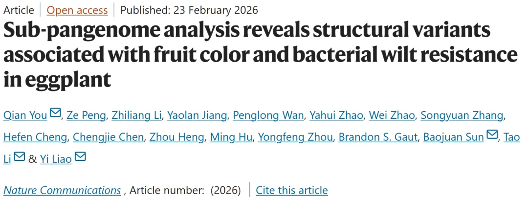 课题组联合广东省农业科学院蔬菜研究所等单位,对226份以东南亚和华南种质为主的茄子材料开展群体基因组学研究。研究团队利用长读长测序新组装11个代表性材料的染色体水平基因组,并结合已发表数据构建了高质量茄子泛基因组。研究鉴定到位于10号染色体上的一个12.4 Mb大型倒位,与果色显著相关;同时发现了与青枯病抗性相关的关键变异,包括SmCYP82D47提前终止突变以及SmEPS1和SmRoq1的拷贝数变异。相关成果发表于Nature Communications (中国科学院一区,影响因子17.2)。