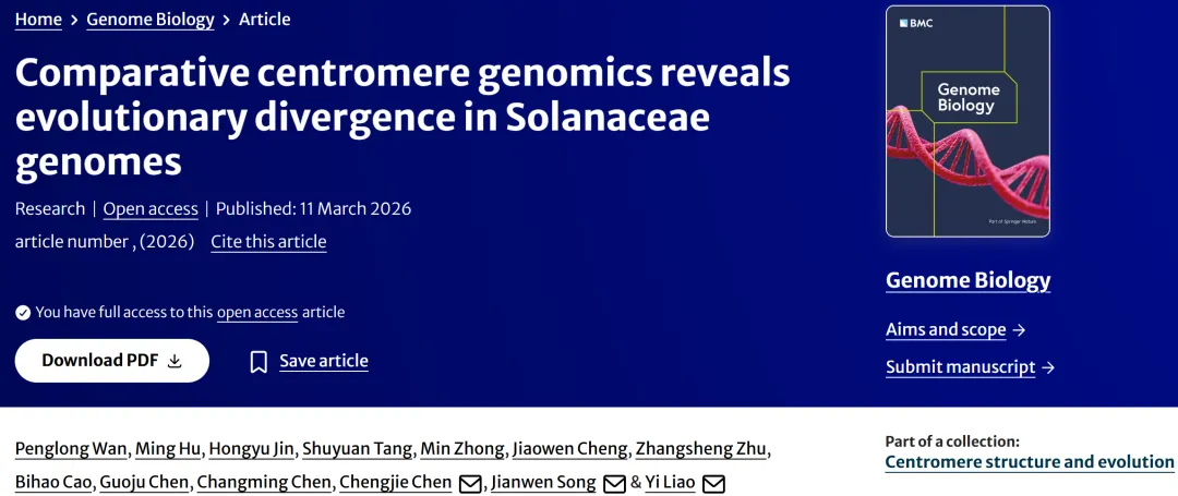 着丝粒是保障染色体在细胞分裂过程中准确分离的关键区域,但由于其高度重复和快速进化,长期以来解析难度较大。课题组结合近端粒到端粒水平(T2T)基因组组装和CENH3 ChIP-seq技术,系统解析了茄子、非洲茄子、烟草、马铃薯、番茄、辣椒及其野生近缘种的功能性着丝粒区域。研究发现,除番茄及其野生近缘种3号染色体外,茄科作物着丝粒主要由Ty3/Gypsy类LTR逆转录转座子组成,普遍缺乏传统卫星DNA。进一步研究表明,着丝粒周边倒位和着丝粒重定位共同驱动了着丝粒位置的频繁变化,揭示了茄科作物着丝粒显著的动态演化与物种特异性特征。相关成果发表于Genome Biology(中国科学院一区,影响因子16.3)。